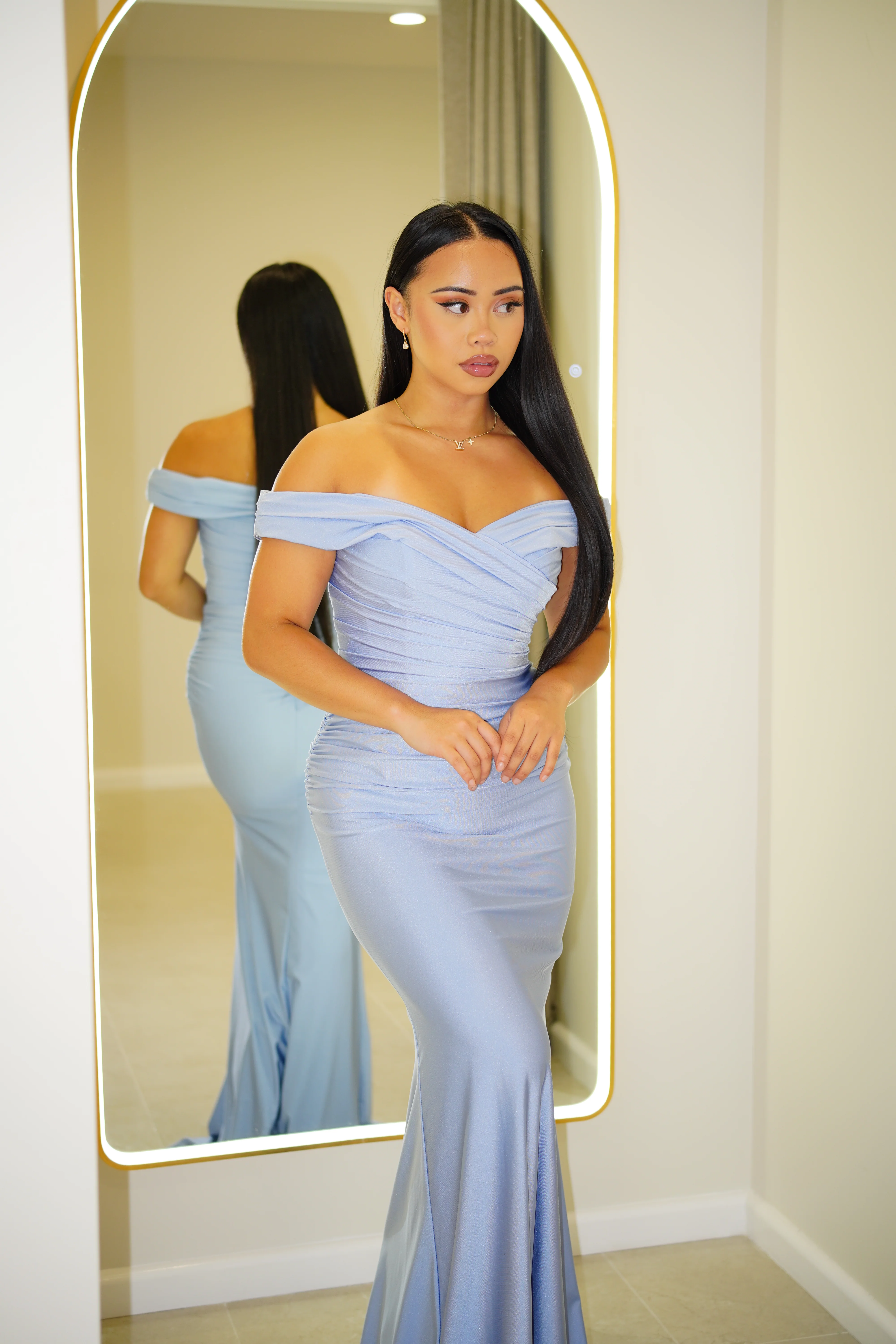 This fitted gown showcases an off-the-shoulder sweetheart neckline, beautifully complementing the ruched waist and hipline for a flattering silhouette. Crafted from stretch jersey, the fit-and-flare design effortlessly enhances your natural shape while allowing graceful movement. Perfect for weddings, bridesmaids, or formal events, this elegant dress offers a timeless and sophisticated look.