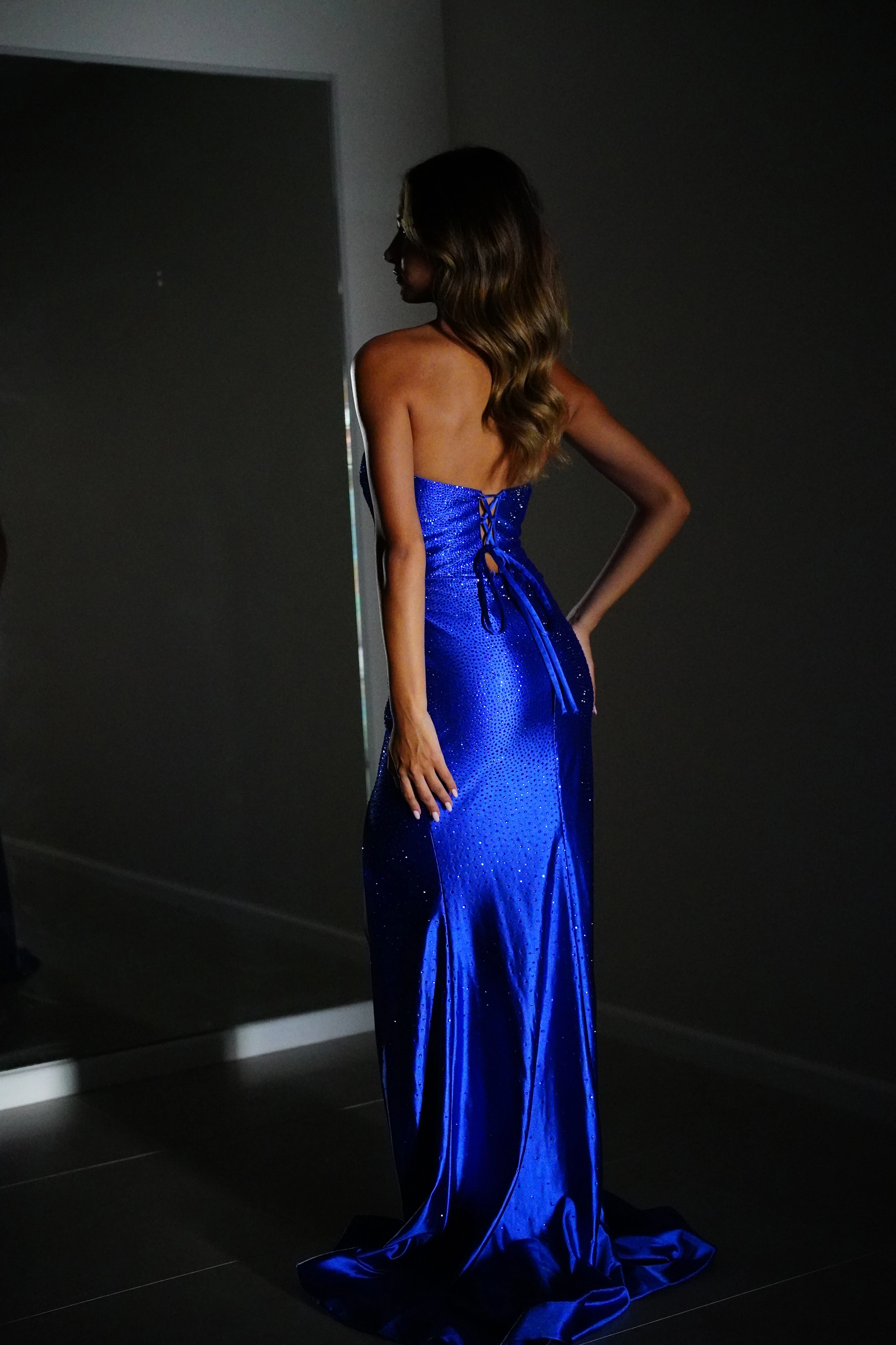 This hot gown is for the girl who doesn’t just walk into a room… she arrives. Crafted in a luxe, figure-hugging stretch satin and drenched in subtle sparkle, this dress catches the light with every step – giving you that glow-from-every-angle moment.